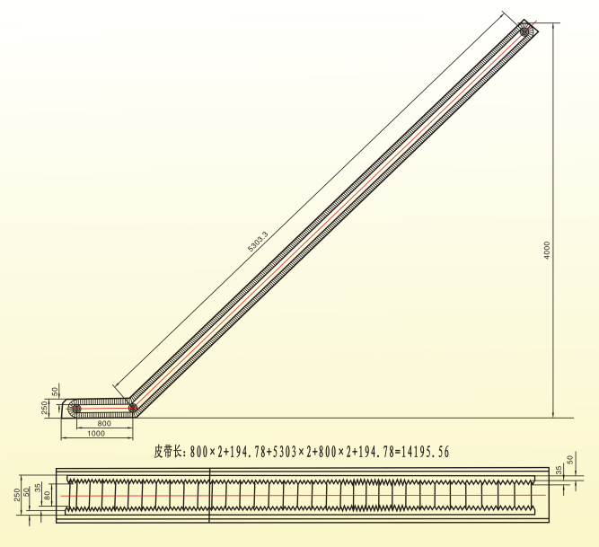 Note: the length of skirt conveyor belt is 14.4m × 1 piece, the height of skirt and shelf is 50mm, the thickness of skirt is 3mm, the thickness of shelf is 8mm, and the thickness of belt is 5mm
